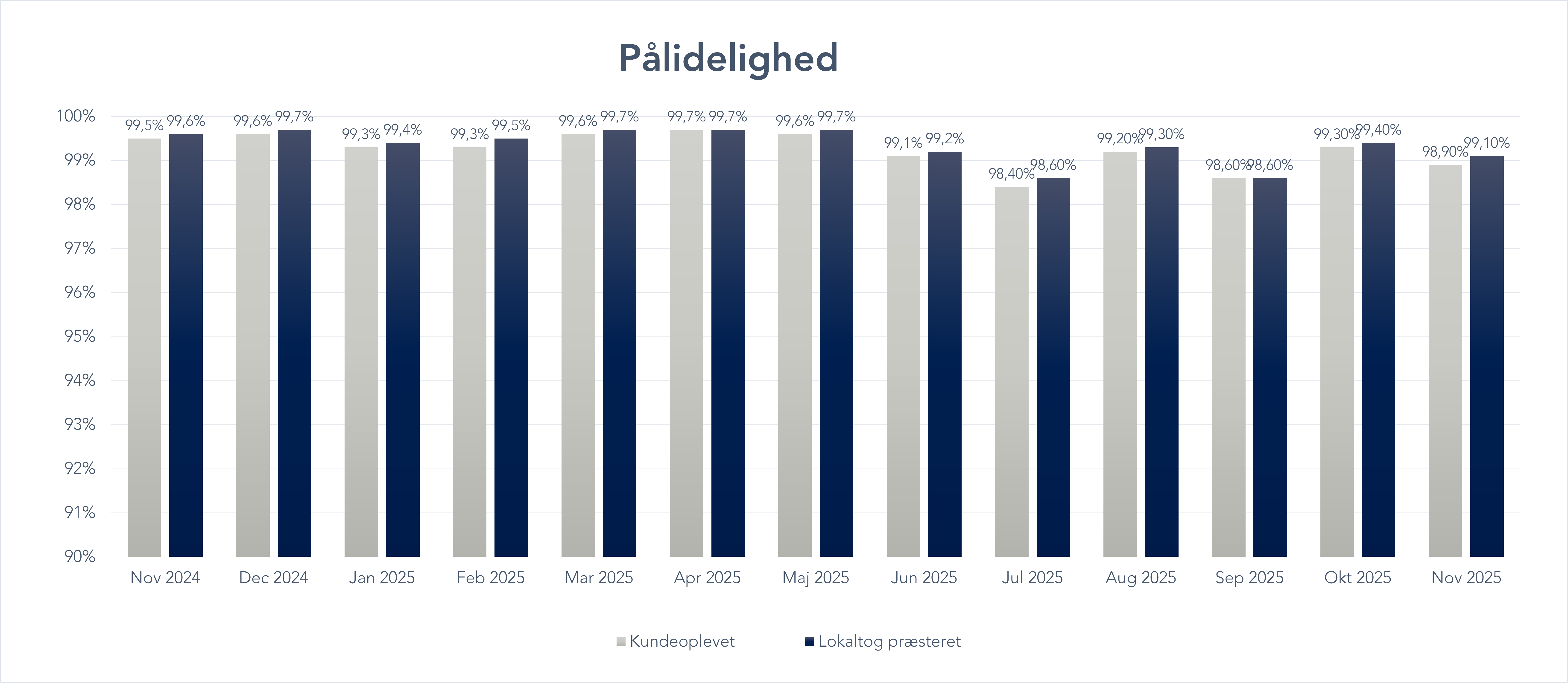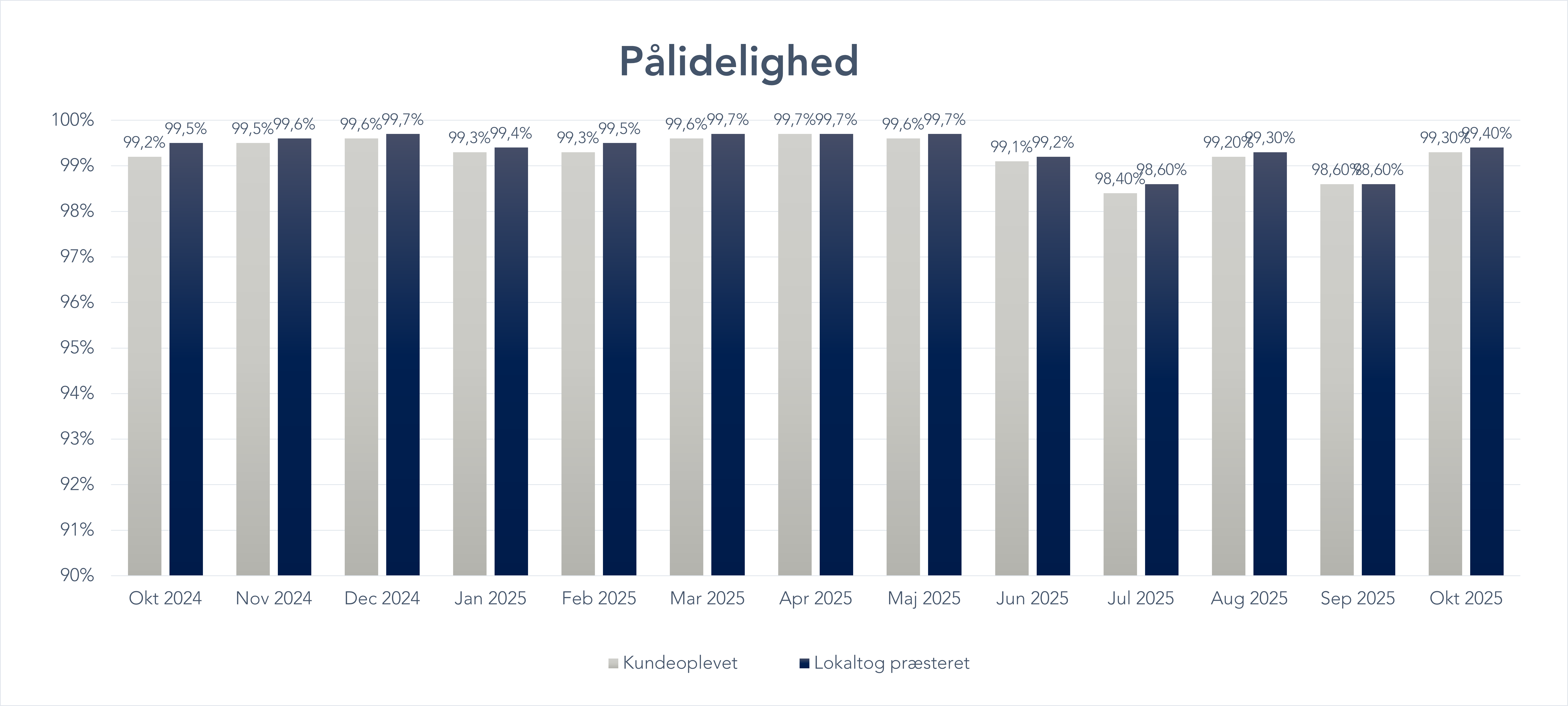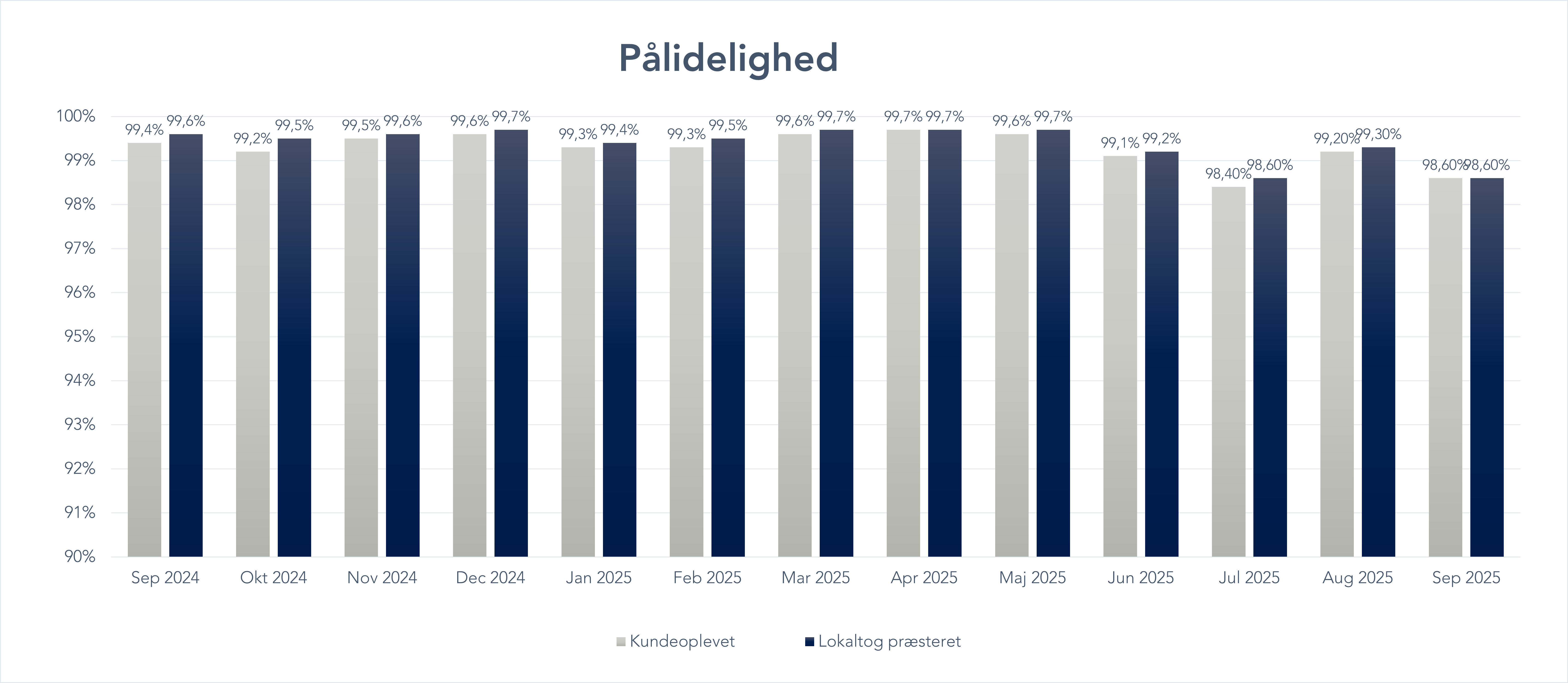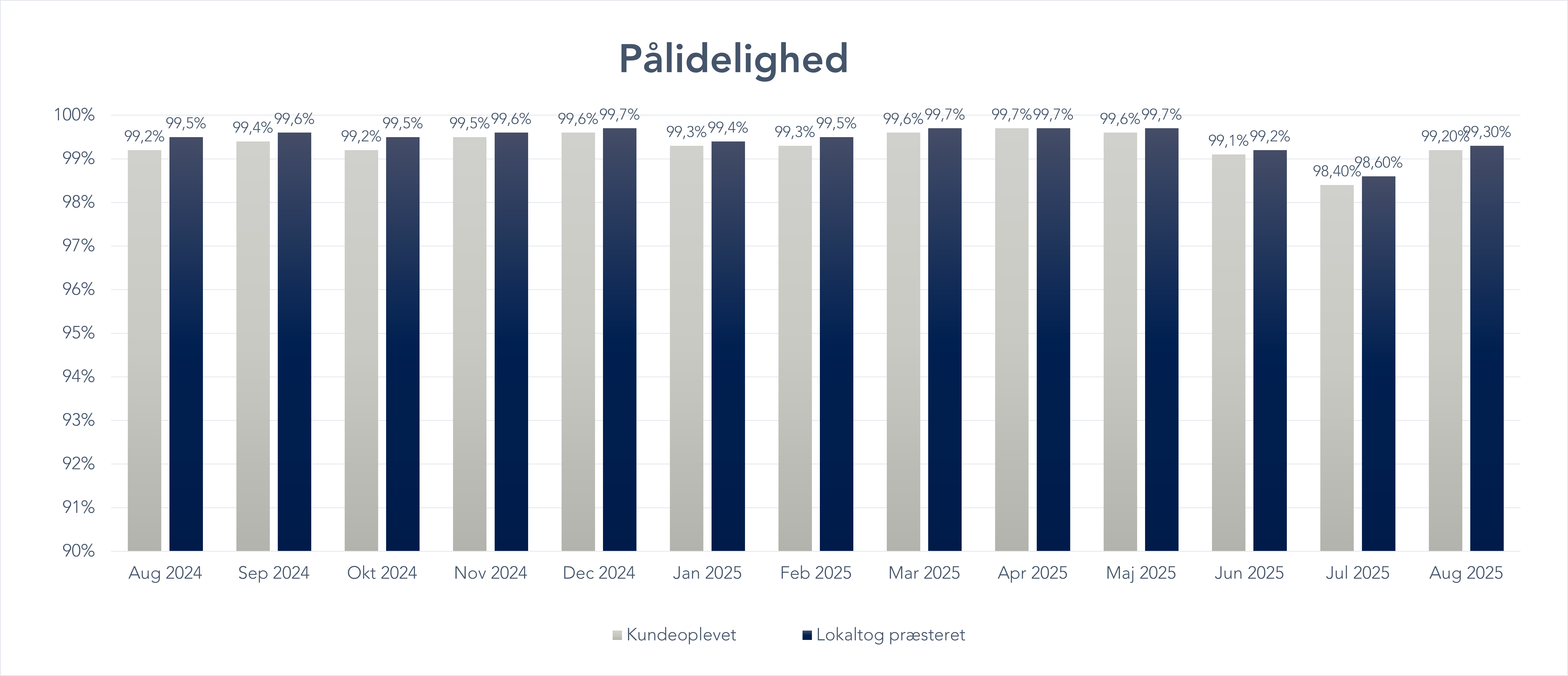 - Kundernes oplevelse: Her tæller alle årsager med – uanset om det er noget, vi har kontrol over eller ej. Dette giver et billede af, hvordan du som kunde oplever vores togdrift.