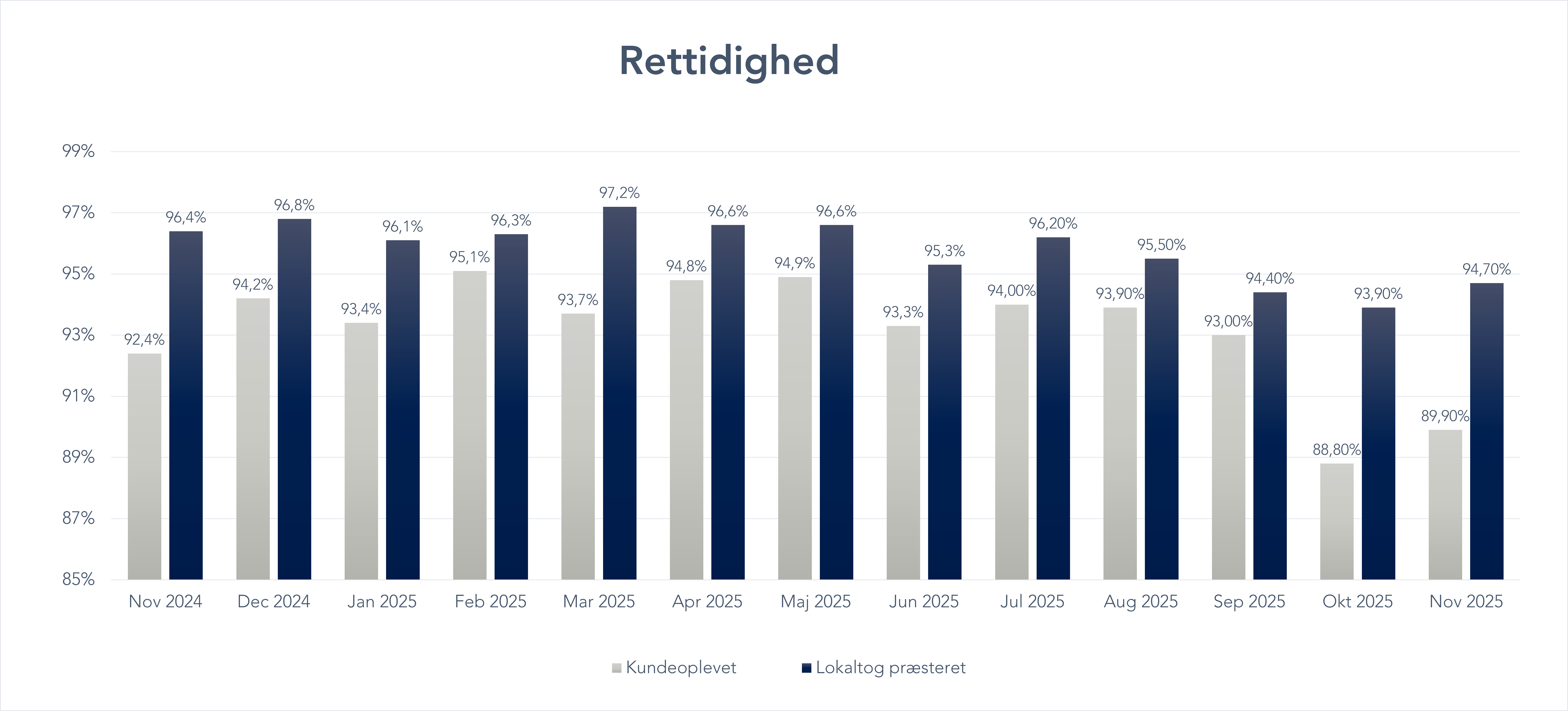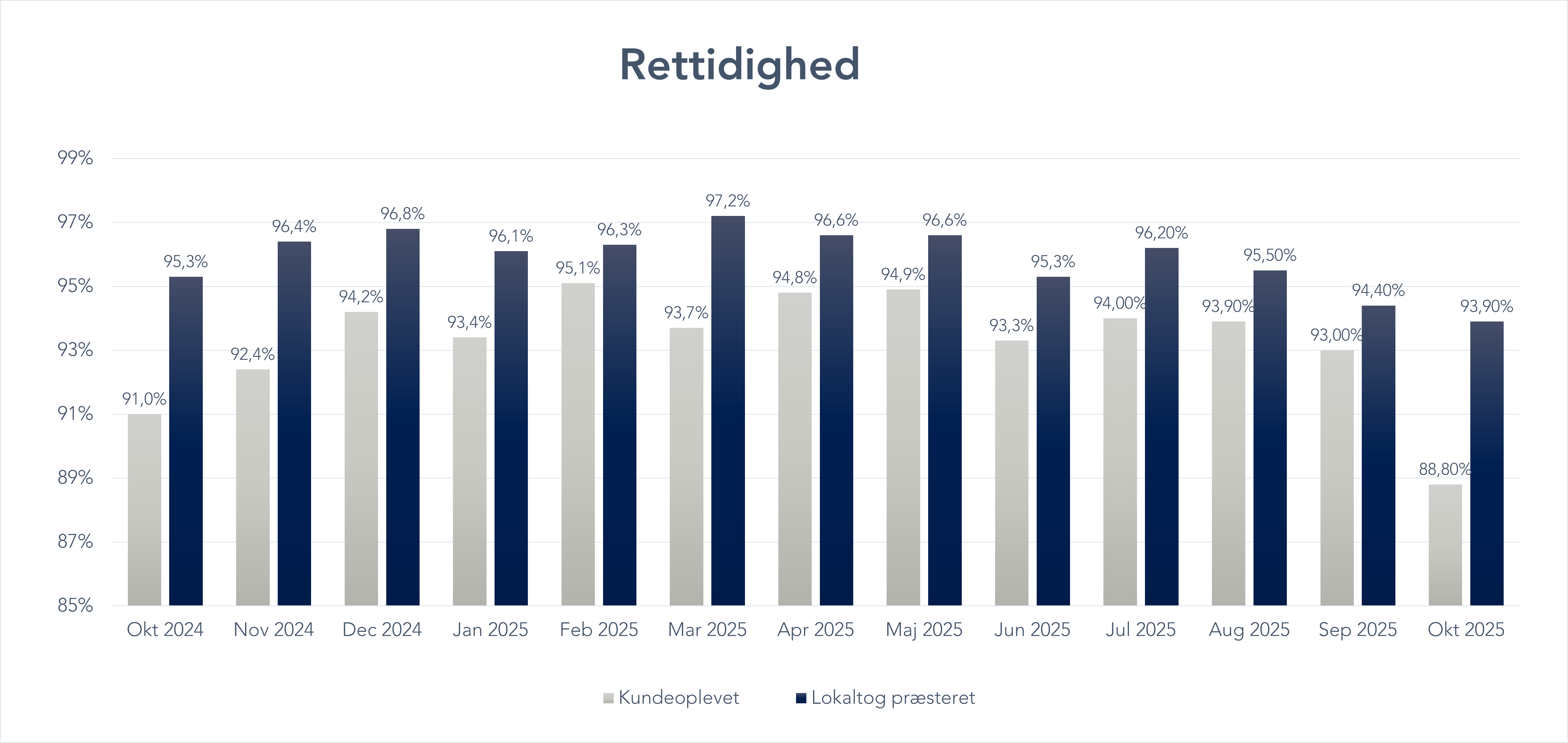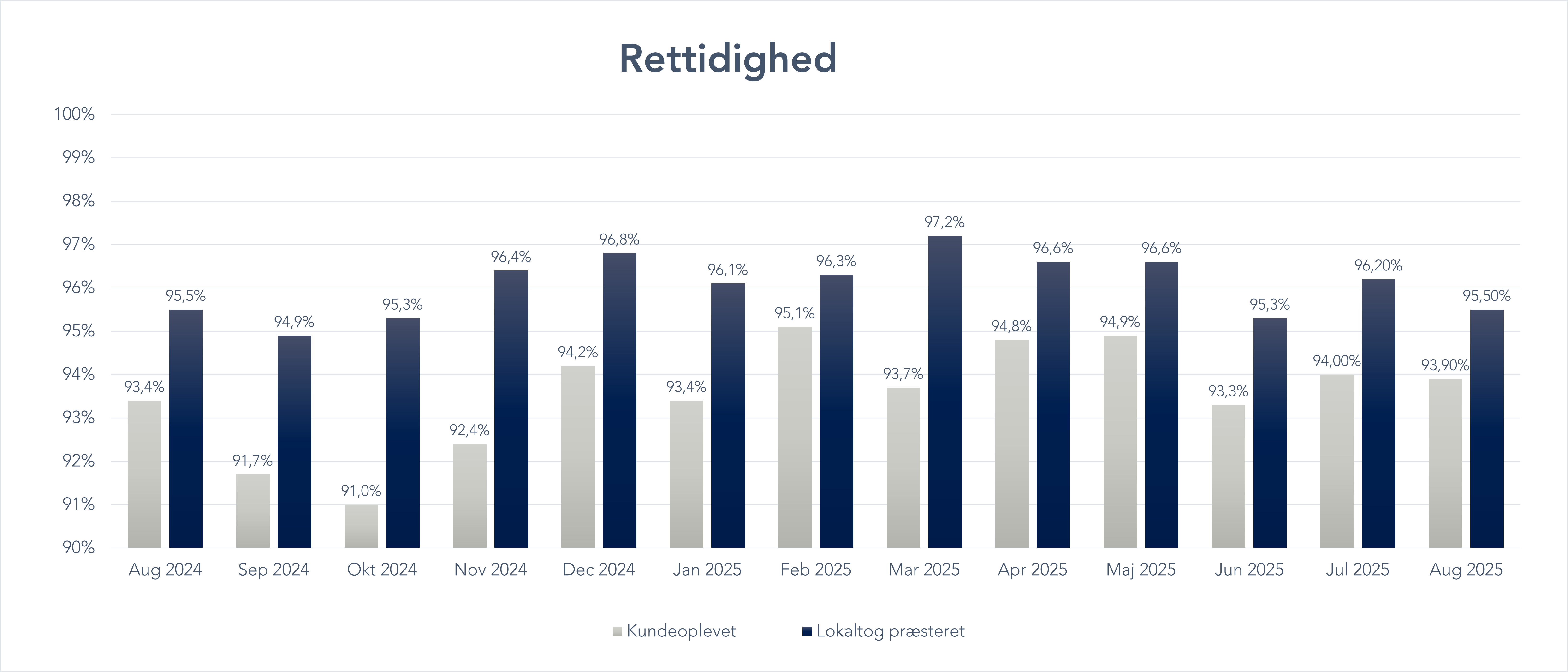 - Lokaltogs egne resultater: Her ser vi kun på forhold, vi selv kan kontrollere – som vores tog, medarbejdere, køreplaner og vores egen infrastruktur. Forsinkelser, der skyldes eksterne faktorer som vejrforhold eller fejl på Banedanmarks infrastruktur, tæller ikke med i disse tal.