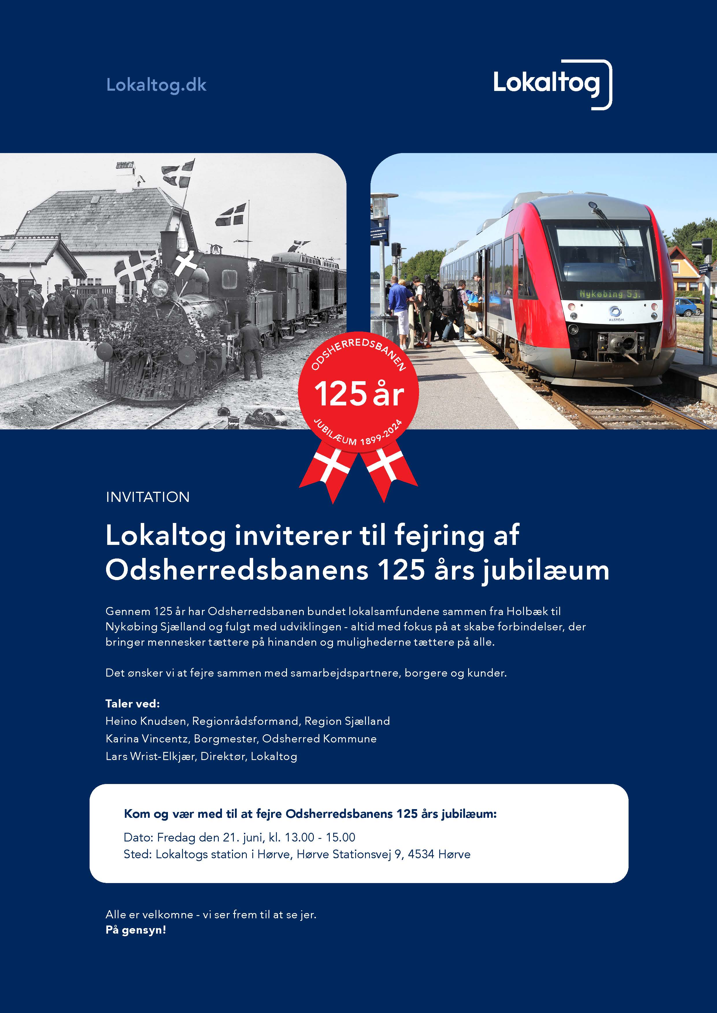 Nu, i 2024, står vi ved 125-års jubilæet for Odsherredsbanens indvielse, og det skal fejres med manér. Vi inviterer dig til at deltage i festlighederne fredag den 21. juni på Hørve station fra kl. 13 til 15. Regionsrådsformand Heino Knudsen, Odsherreds borgmester Karina Vincentz og Lokaltogs administrerende direktør Lars Wrist-Elkjær alle vil holde inspirerende taler.