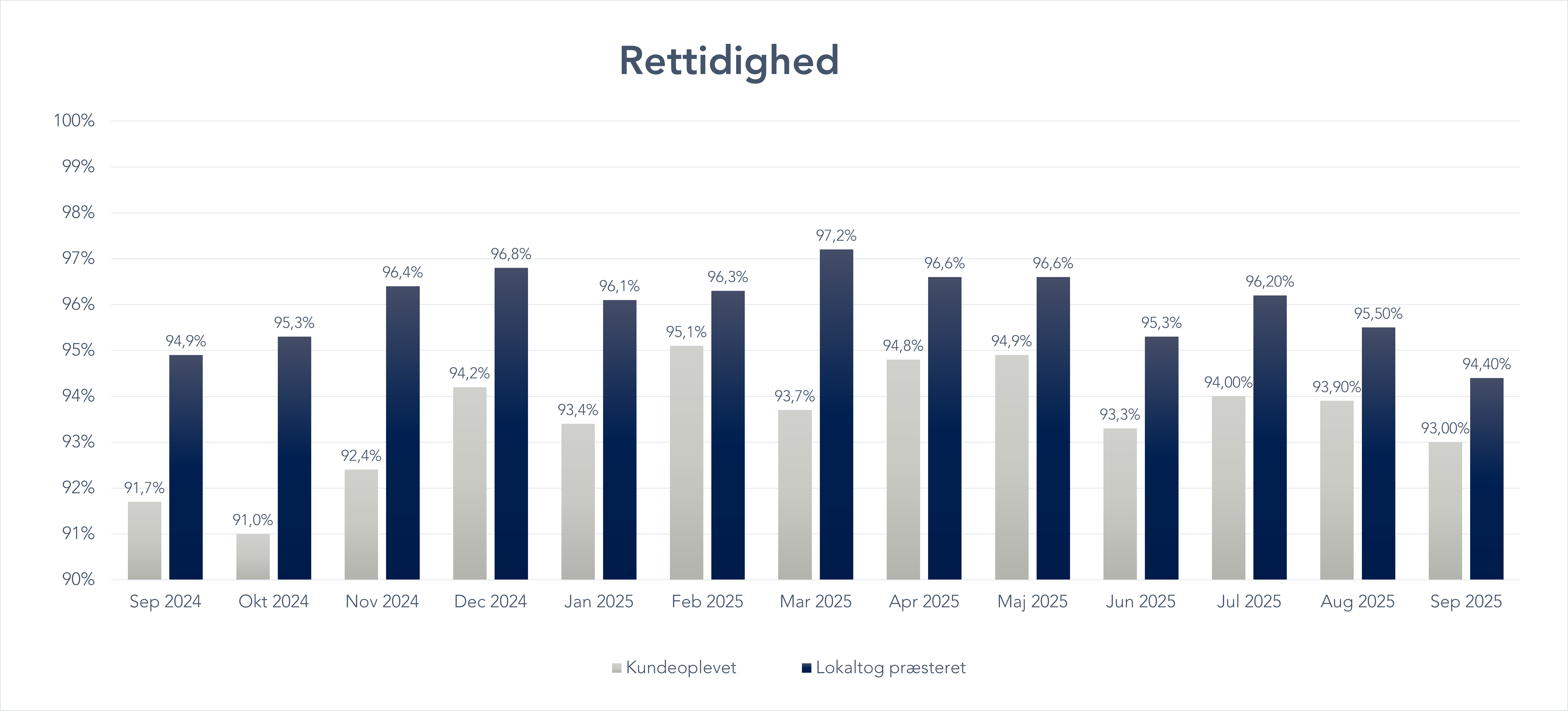 - Lokaltogs egne resultater: Her ser vi kun på forhold, vi selv kan kontrollere – som vores tog, medarbejdere, køreplaner og vores egen infrastruktur. Forsinkelser, der skyldes eksterne faktorer som vejrforhold eller fejl på Banedanmarks infrastruktur, tæller ikke med i disse tal.
